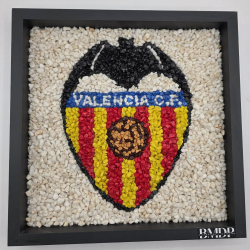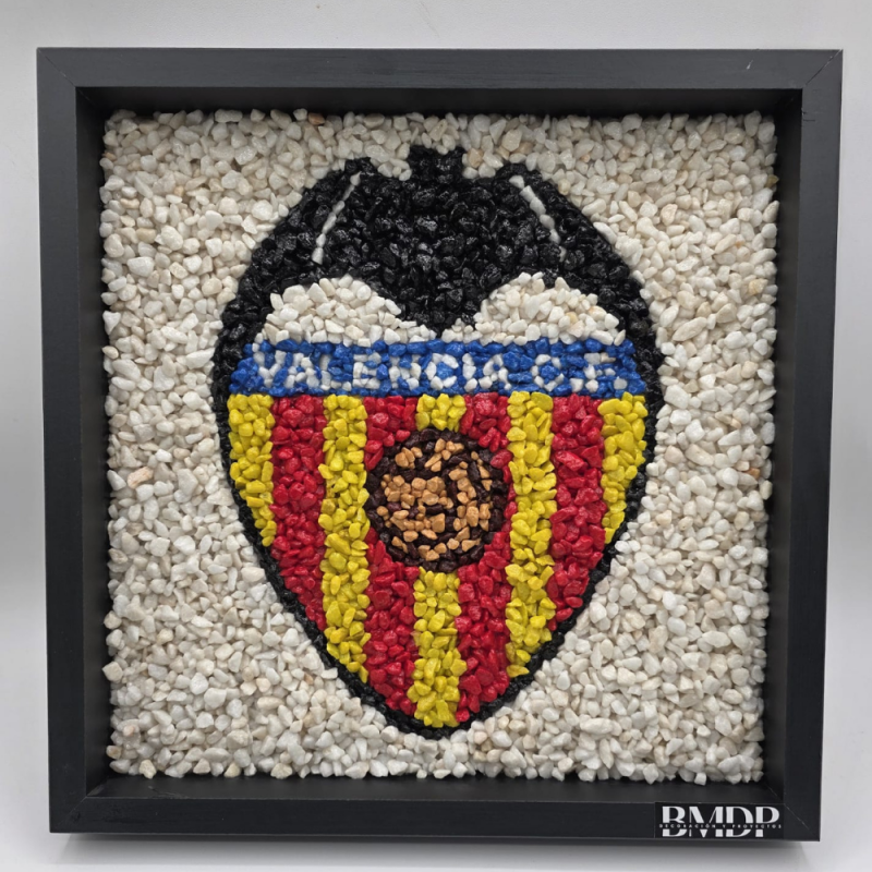 Este cuadro, con escudo de fútbol en piedras decorativas, es una creación artesanal elaborada a mano por nuestro equipo en BMDP, pensada para transformar la pasión por el fútbol en una pieza decorativa exclusiva.