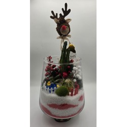 Terrario navideño en cristal con decoración invernal, reno decorativo y mini paisaje festivo. Ideal como centro de mesa o regalo especial en Navidad. Pieza artesanal y única.