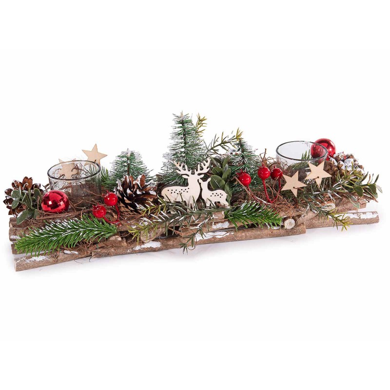 Elegante centro de mesa navideño con efecto nevado, dos portavelas de cristal tipo tealight, piñas invernales, ramas verdes y detalles decorativos en rojo y madera. Ideal para vestir mesas y espacios festivos. Exclusivo de BMDP – NavarroDecoració en Valencia.